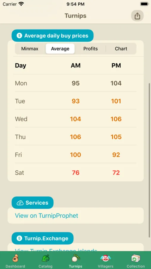 - Turnips: The app have a built in prices predictions algorithm, once you'll have added your Sunday buy price and Monday first price from your in game store the application will start to make daily predictions. The more prices you add during the week the better it'll be.