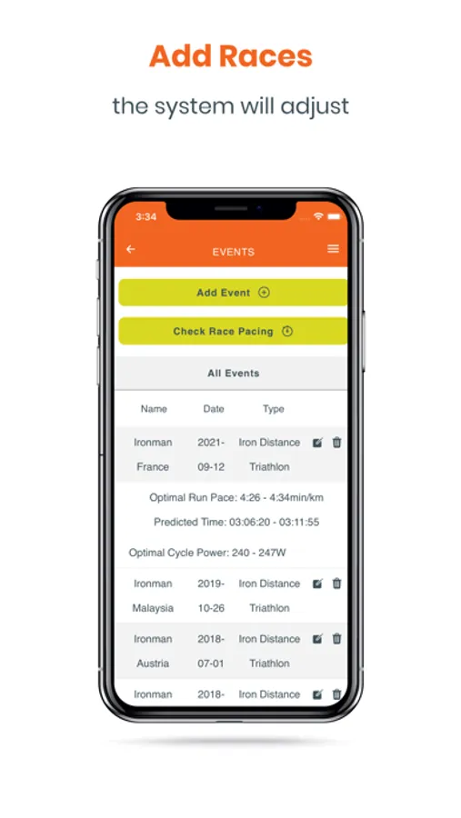 Events and races can be added to the system and the athlete's training program will update to prepare the athlete optimally for key races. MPG will include variables such as date, race type, distance and course profile and combine this with performance and training history to create the optimal training stimulus in the build up to key races.