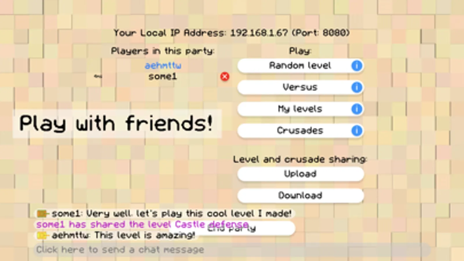 Multiplayer: Play with as many other players as your device can support. You can play in co-op or versus, chat, and share levels and crusades you've made in multiplayer parties.