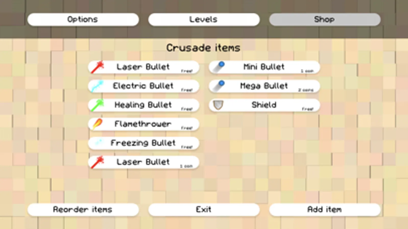 Crusade editor: Once you've made (or saved) several levels, you can put them together into your own crusade. You can then set up a shop for that crusade where players can spend their coins.