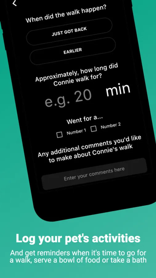 You can register your pets and begin logging their activities, such as going for a walk, serving a bowl of food or taking a bath. We will then keep you informed with a reminder when it's time for another activity.
