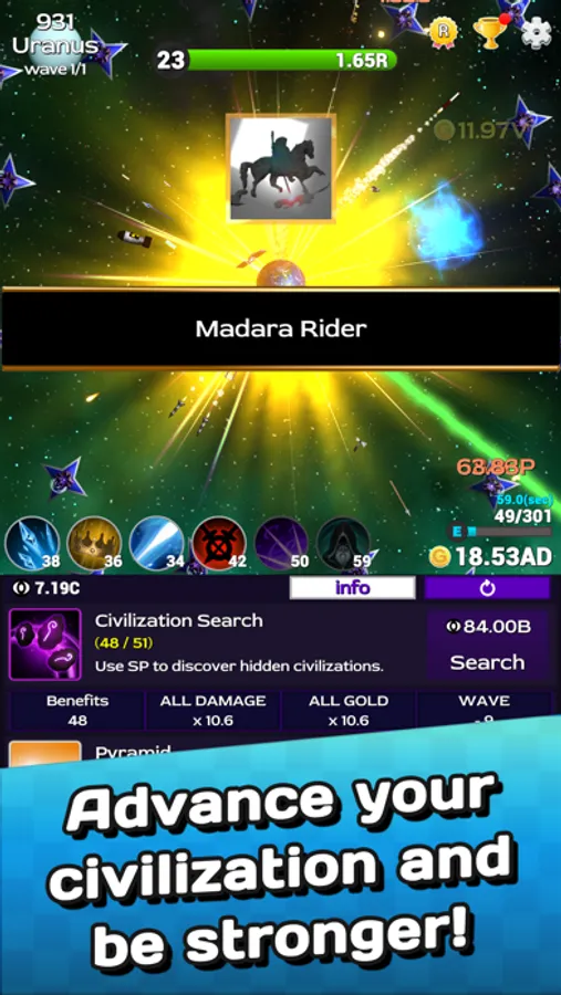 Are you having a hard time stopping the invasion of the universe? Discover and advance civilization with the SP (Search Point) acquired through the wormhole!