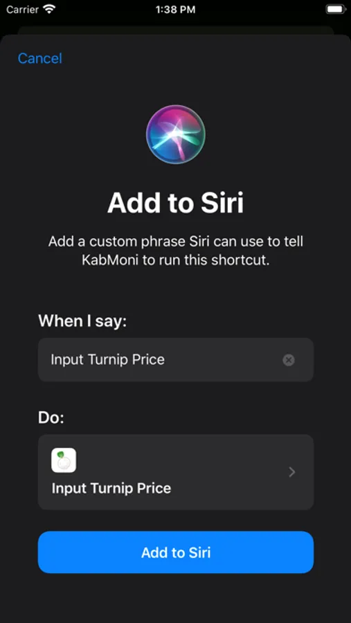 KabMoni supports Siri Shortcuts.