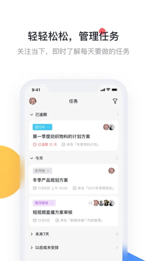 1. 管理任务,展示被分配的所有任务。可通过分组、筛选,快速定位任务,支持修改任务状态、成员、时间等各类型的数据;