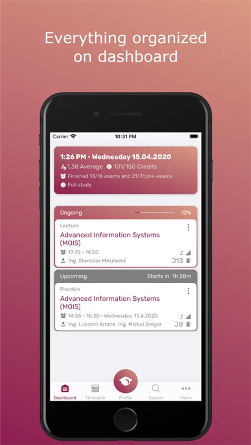 Study screen with an overview of study results, the current timetable, job offers, and more.