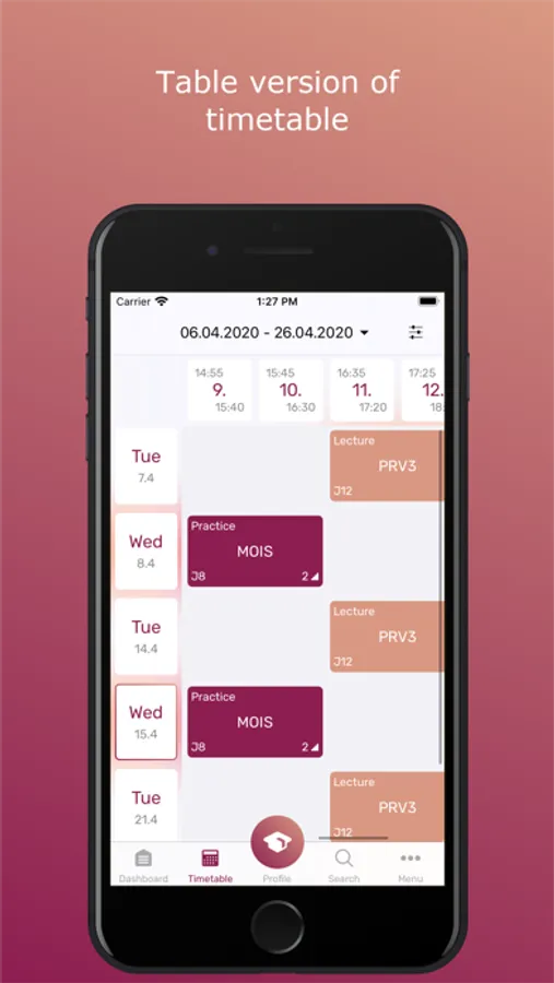 Timetable displayed as a list, table, or daily agenda. You can select a time interval to display the timetable.