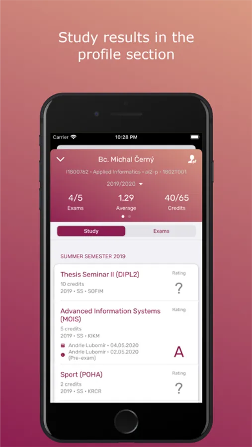 Profile with a list of courses and grades with an extended overview of the achieved study results.