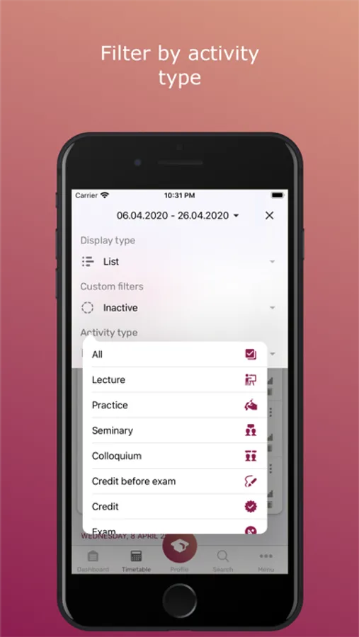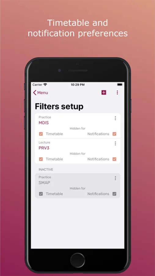 Setting up a timetable where you can hide specific subjects or activity types from the schedule or notifications.