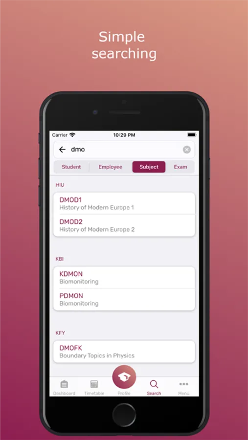 Searching for students, teachers, subjects, and exam dates throughout the university.