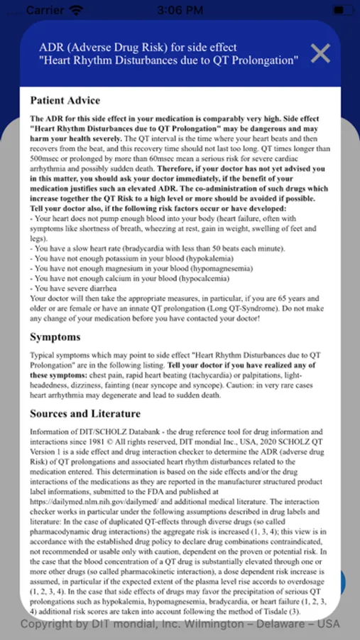 Medication errors are a huge worldwide problem which cause substantial avoidable numbers of sick people, hospitalizations, and more dead people than by street traffic. Drug-induced QT Prolongation is one of the most dangerous adverse drug effects leading to heart rhythm disturbances which in the worst case may end with sudden cardiac death. Drug drug interactions, side effects and individual patient risk factors are the major reasons for this avoidable adverse drug risk (ADR). Millions of U.S. american patients, in particular elderly people, are due to their multiple chronic diseases daily on multiple drugs. Many of them take drugs which may prolong the QT time. Good reason to give patients themselves a tool into their hands to protect from avoidable adverse drug events. SCHOLZ QT is this tool, an easy to use and free of cost APP. Just enter your drugs and detect which drug combinations might be especially hazardous and when you should call your doctor!
