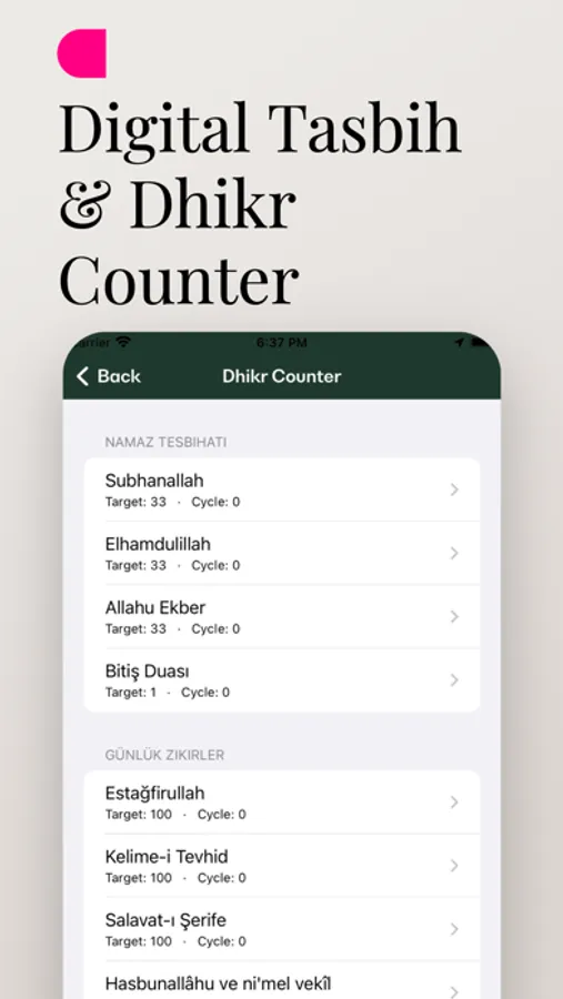 • Dhikr and tasbih counter: Set targets and keep count for daily dhikr.