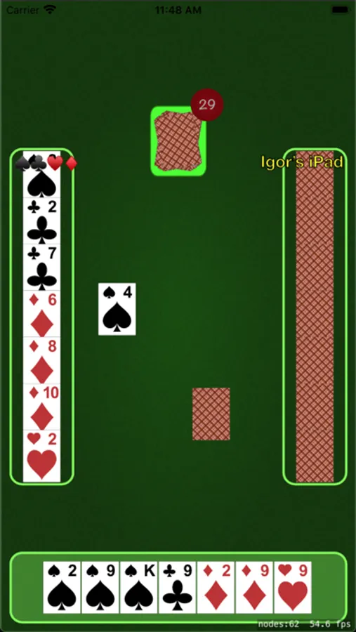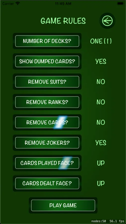 One player starts a new game by tapping on the New Game button, and then selecting game rules on the next panel. Choose how many decks you want to play, which cards should be removed from the deck, whether cards should be dealt and played with face up or down.
