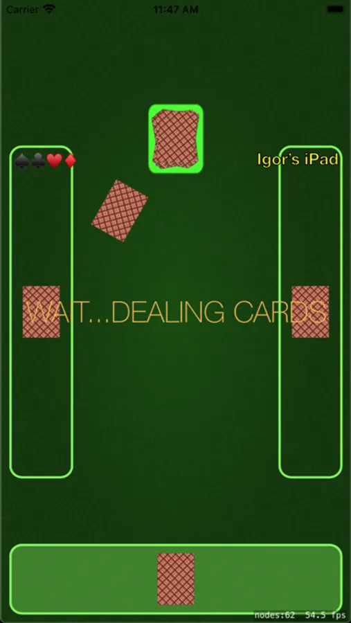 Once you are playing, move cards on the table, to your hand or to the deck by holding you finger on a card and moving it. Note that you cannot move a card to other players' hands. Double tap on a card to flip it; the card will also be flipped for other players. Dump a card(s) by swiping the table to the right. Swipe the table to the left to return the dumped cards to the table (up to 5 times). If you want to keep a card on the table while dumping the others, tap on the card and hold it for a few seconds until the card is selected. Now, this card will stay on the table when you swipe to the right. Do the same to unselect the card. If you have too may cards in your hand and you can barely see their ranks or select any of them, tap on your hand and hold it for a few seconds. Now you can scroll through your cards.