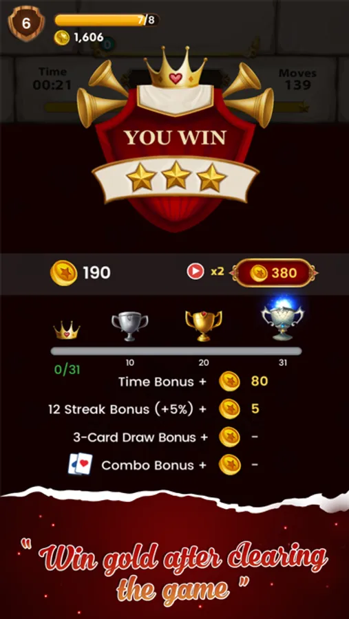 - You can also have the challenge with Solitaire arcade play mode and go from easy Draw 1 up to Draw 2 or 3 games depend on your levels (from low to high levels).