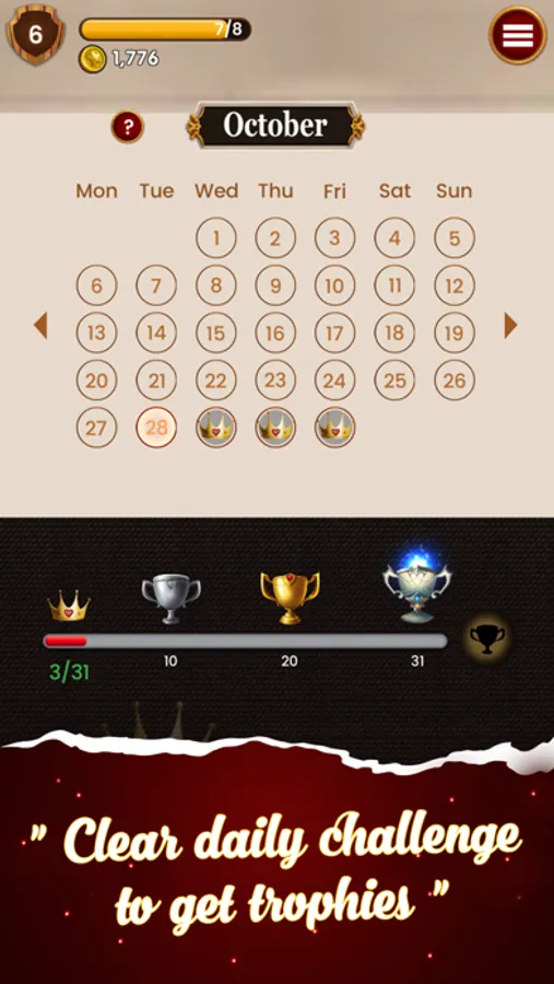 If you like the classic Windows Solitaire, you're going to love our old school free game! Train your brain and solve the Daily Challenge to receive a crown for that day. Earn trophies each month by winning more crowns! Play our Daily Challenges and solitaire free! Klondike Patience has never been better!