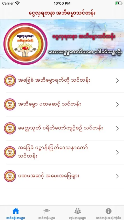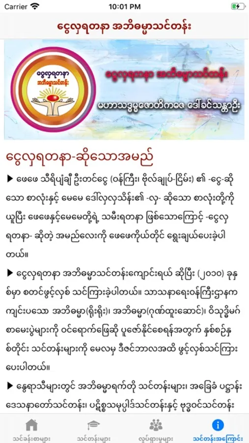 Ngwe Hla Yadanar Dhamma Learning Application is intended for those who are interested in Buddhism Dhamma and willing to learn in self-study teaching methods. It includes a series of Dhamma classes, especially Abhidhamma classes, conducted by Ngwe Hla Yadanar Dhamma Learning Centre.