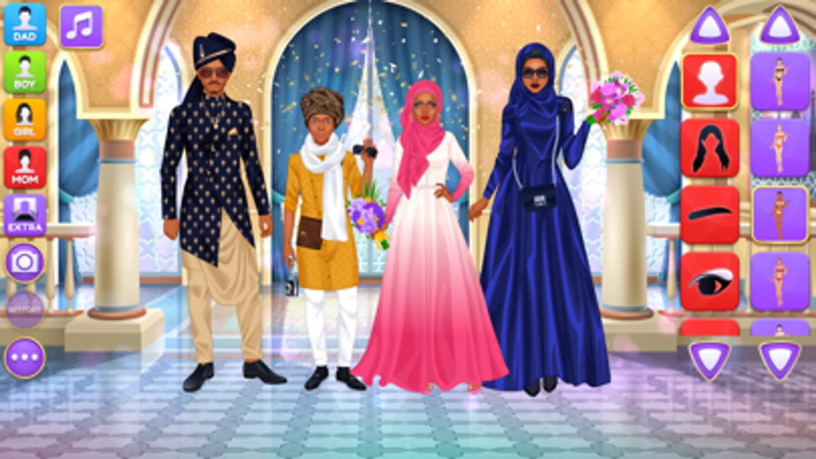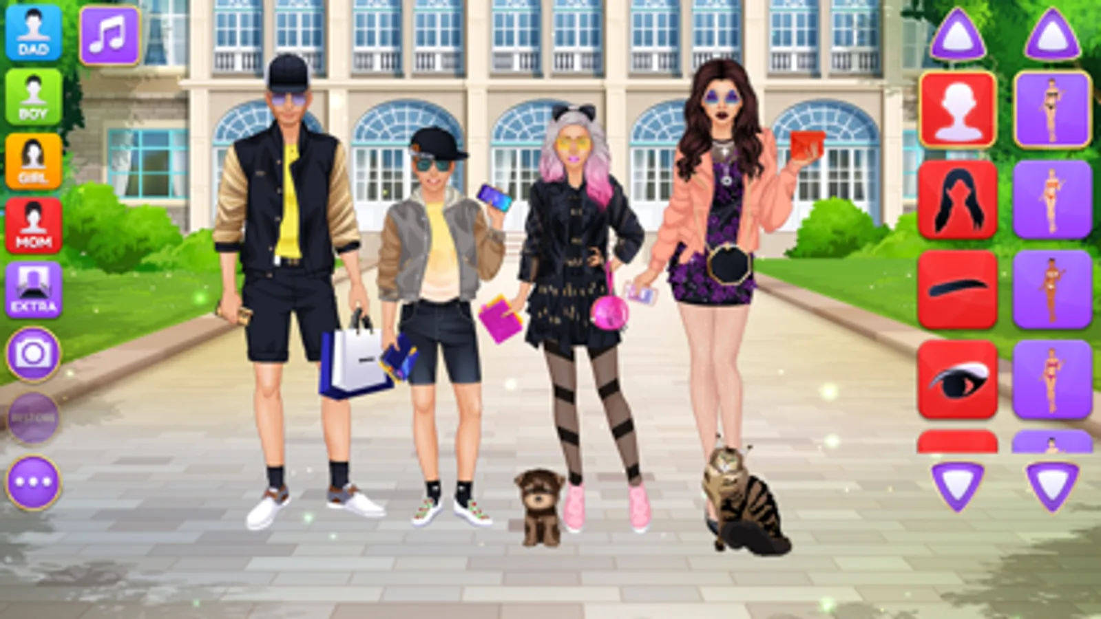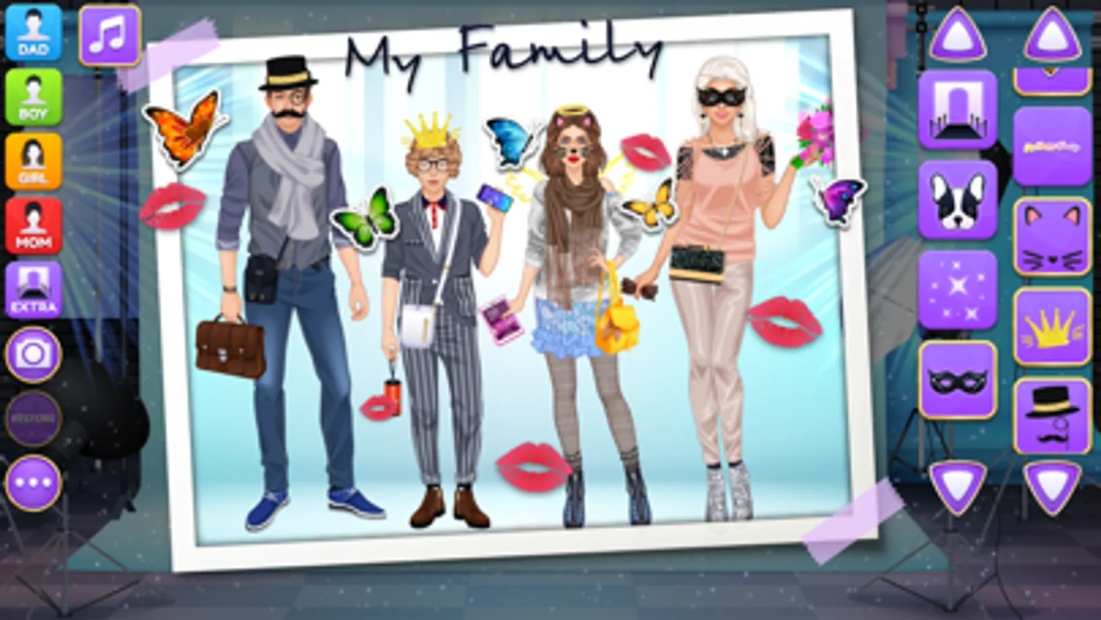 Design luxury outfits and amazing looks for a superstar family of 4 gorgeous virtual models on the same screen! Each character have their own wardrobe with 200+ items of apparel, makeup and accessories. Add cute pets, fireworks and various cool stickers to get the final picture ready for a photo album. Grab a screenshot by pressing the "Camera" button inside the game and share the picture with your friends and family online to show off your fashionista talents.