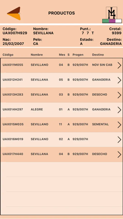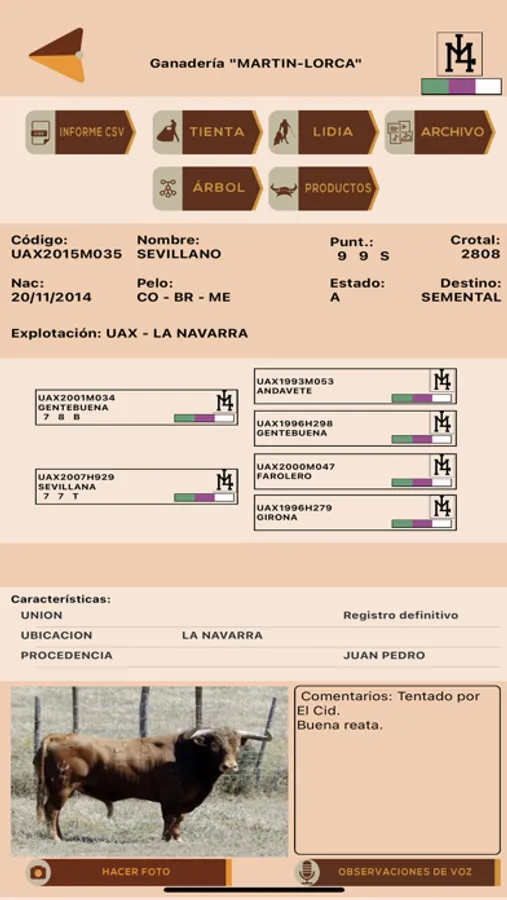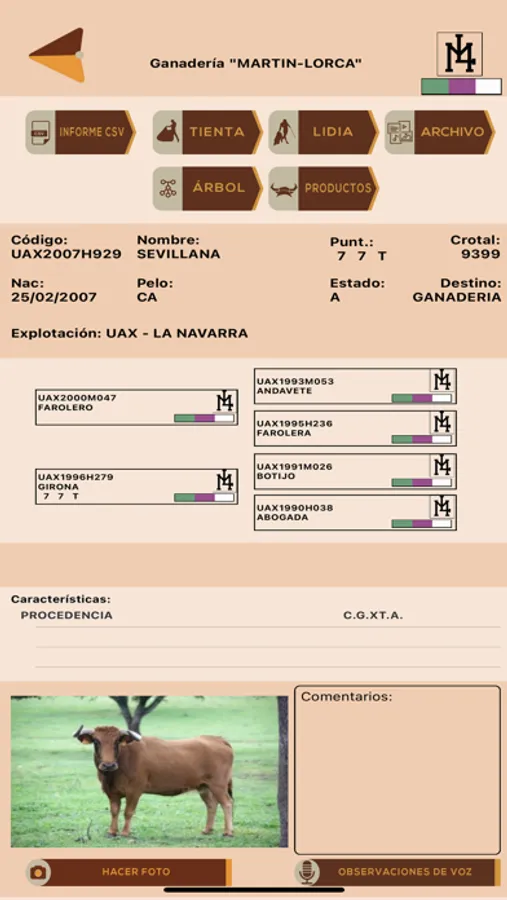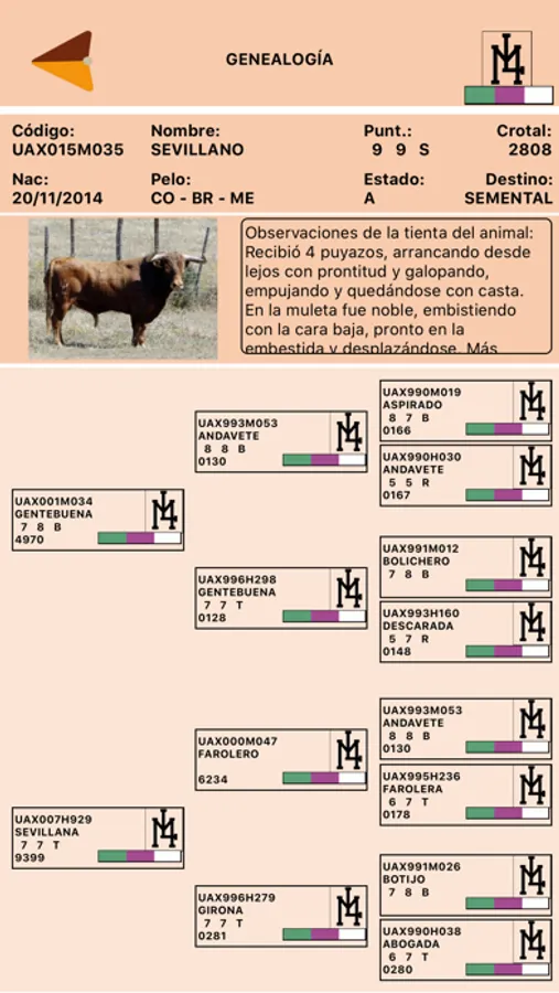 También permite ver las fichas de los productos de un semental o una vaca y genera un árbol genealógico con hierros, divisas y puntuaciones, permitiéndonos movernos por las distintas generaciones.