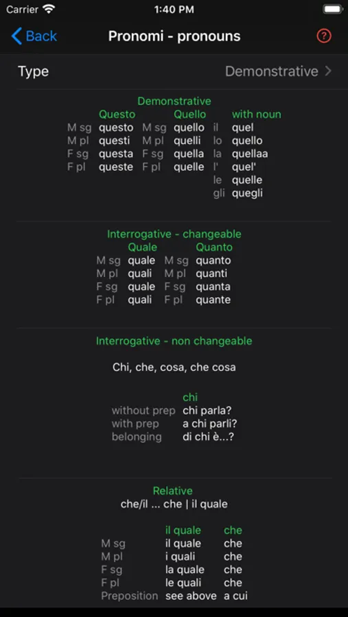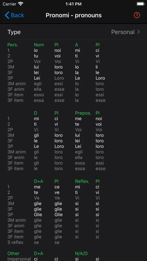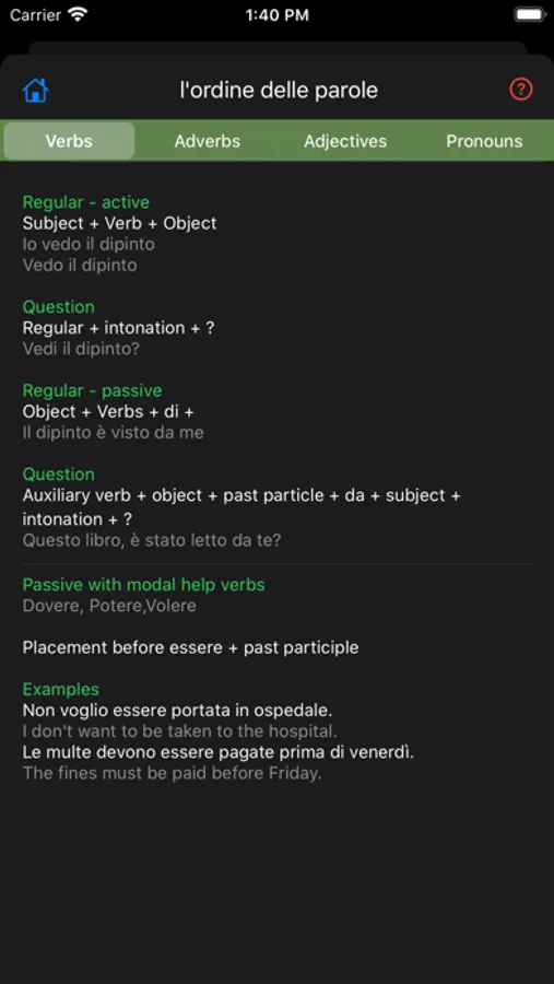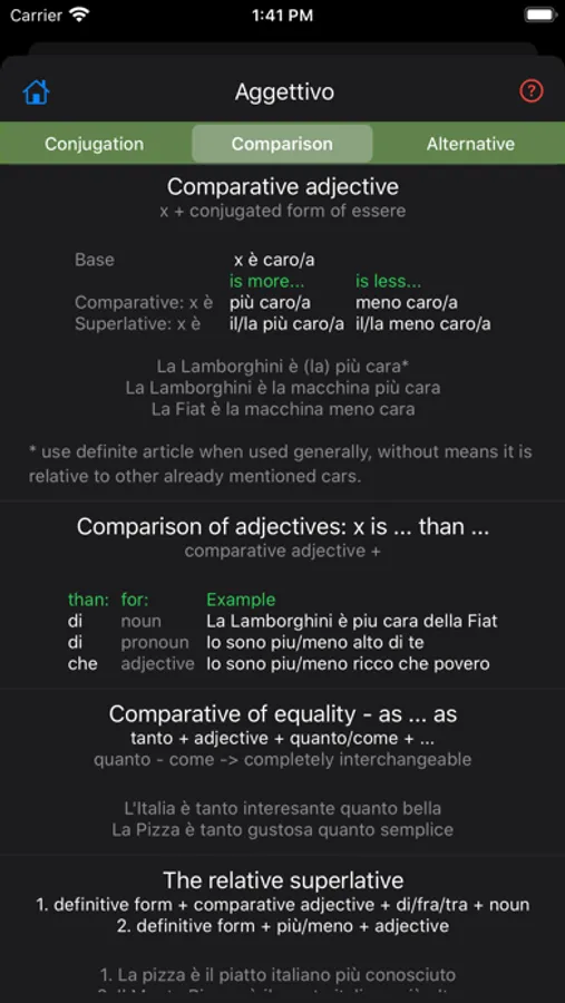 Dedicated to the learner, easy and simplified, yet extensive and broad. Examples help making sense of it all. This app is directed towards the one who every now and then needs to quickly look up parts of Italian grammar. As you always have your phone with you (or watch), it is faster than the internet, more convenient (and lighter) than a book. We are constantly adding more content and soon you will be able to have an extensive list of irregular verbs in your pocket.