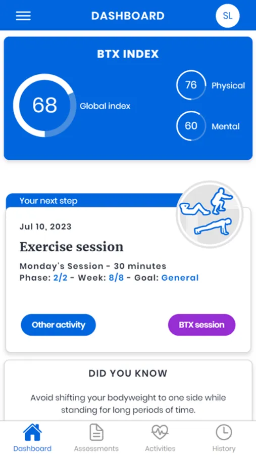 The BTX app allows you to assess your physical and mental capacities in order to take action and progress towards optimal health. Upon the results of the different assessments you will get your BTX index, a global health index that allows you to track your progress.