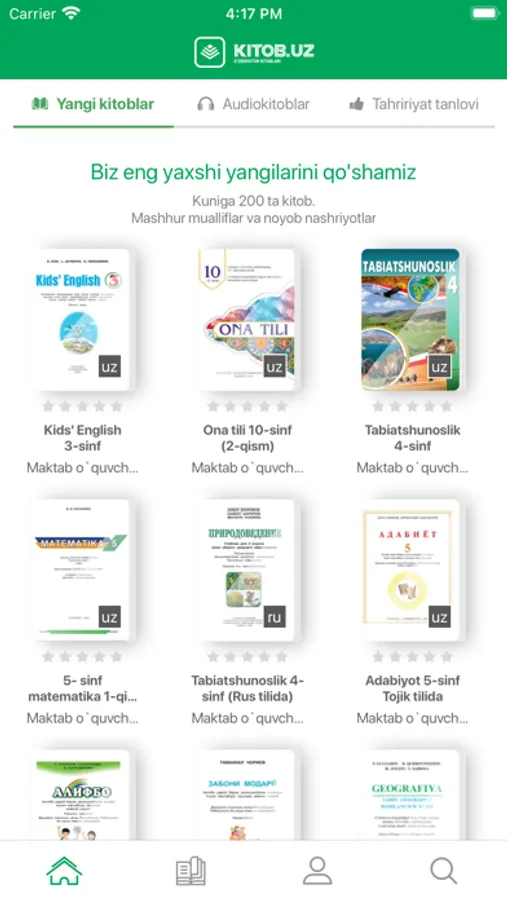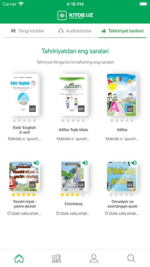 Kitob.uz – bu bolalar elektron kutubxonasi bo'lib, u yerda ko'plab elektron kitoblar va o'zbek tilidagi audio kitoblar mavjud. Turli yoshdagi kitobsevarlar uchun ajoyib imkoniyat! Mazkur ilovada biz siz uchun o'zbek tilidagi eng sara kitoblar va audio kitoblarni to'pladik. Kitoblar va audio kitoblar o'qish va tinglash uchun mutlaqo bepul va doimiy Internetga ulanishni talab qilmaydi.
