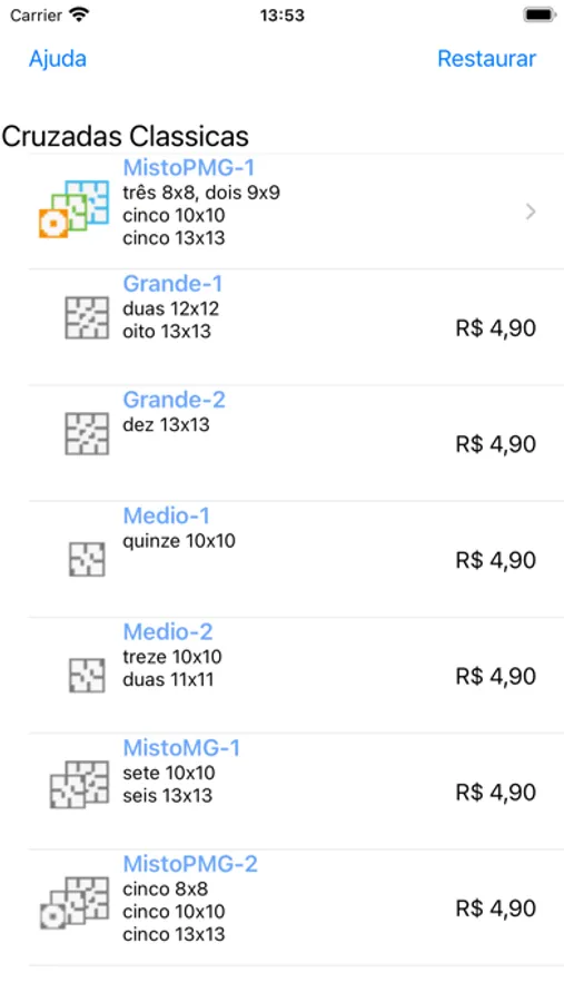 Ao comprar a app você recebe um pacote com 15 palavras cruzadas (três 8x8, duas 9x9, cinco 10x10 e cinco 13x13).