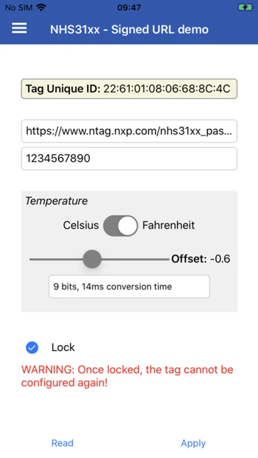 This APP demonstrates how an NHS3100 NTAG SmartSensor can be used for passive temperature monitoring. Besides this iOS APP, one needs to have the NHS3100 starter kit with the demo board. Other supported demonstration boards will become available.