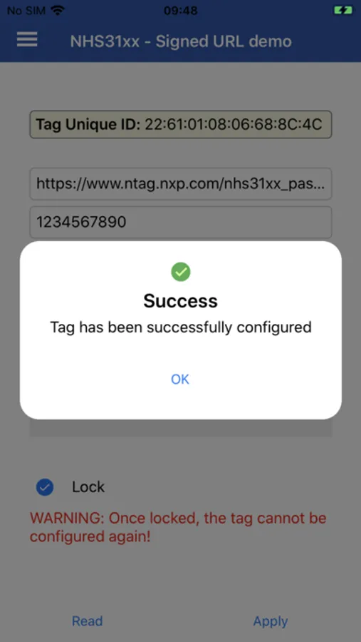 - Use the background reading or a generic NFC reading APP such as NXP's Tag Info to read out the dynamically created URL and launch it in your webbrowser.