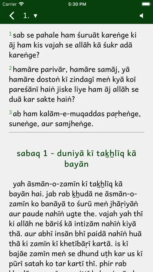 The text is in three scripts: Urdu (اردو), Devanagari Urdu (देवनागरी उर्दू), and Roman Urdu, so you can use whichever you prefer. Every study has the audio as well as excellent questions.