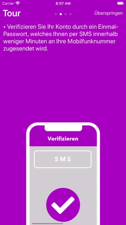 Zur Verifizierung wird eine SMS mit einem Einmalpasswort (OTP) an die angegebene Mobilfunknummer gesendet. Sobald das Passwort bestätigt wird, ist die VIDAgo App einsatzbereit.