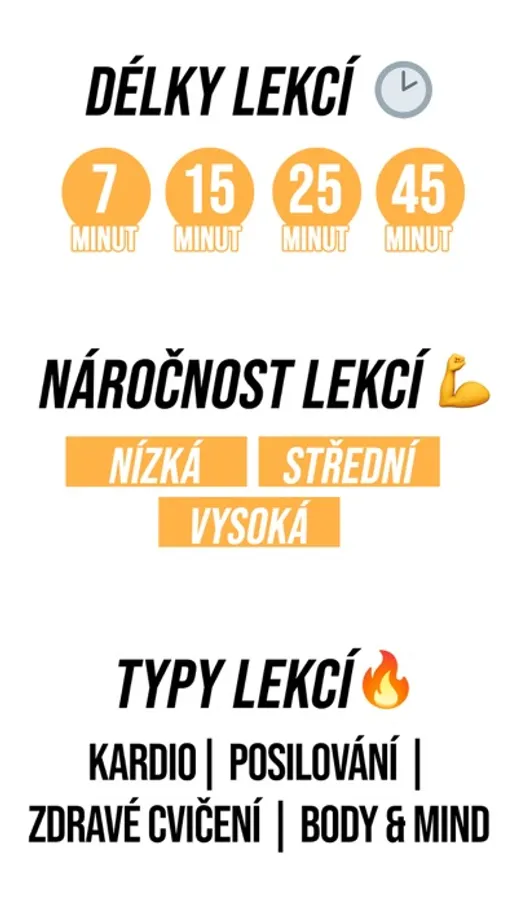 Denně vysíláme až 8 fitness lekcí různého zaměření, v rozvrhu najdete posilovací lekce (Zpevňovačka, Pevné paže, Dokonalý zadeček...), kardio lekce (Spalovačka, HIIT, Problémové partie...), několik typů jógy a pilates, a také krátké 25-minutové lekce (Core, Břicho Express...). K dispozici je také rozsáhlý archiv TOP lekcí, ze kterého můžete lekce přehrávat zcela kdykoliv a najdete v něm třeba i lekce pro těhotné.