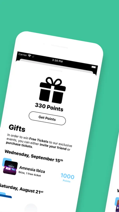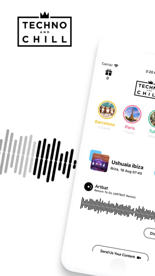 Techno and chill app will give users the ability to purchase tickets, invite friends, and earn reward points which could be used for future ticket purchases as well as redeeming gifts.