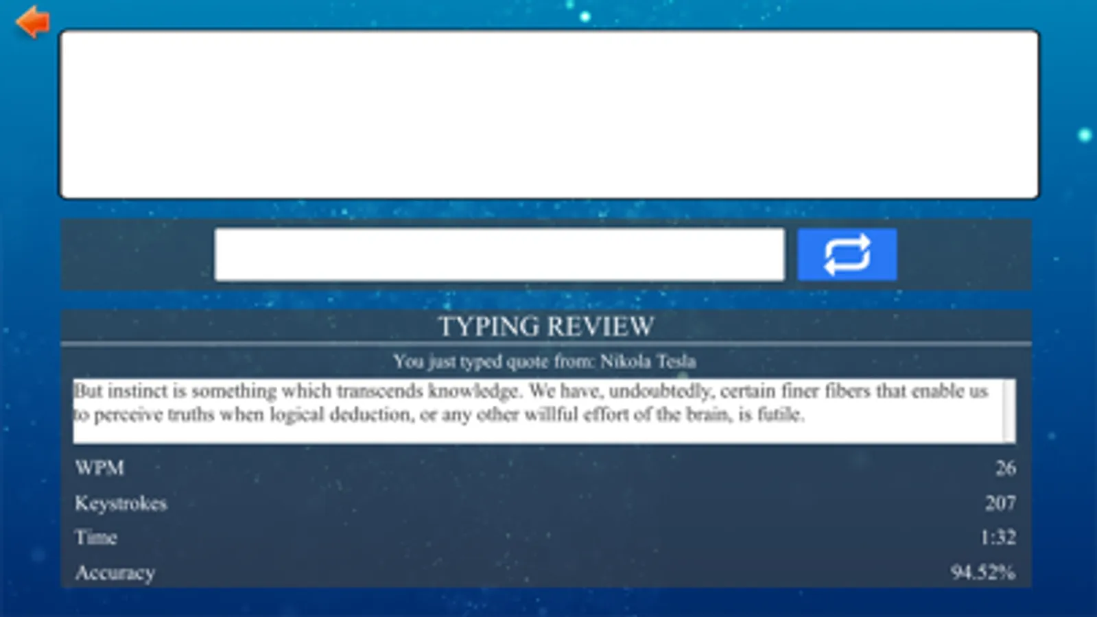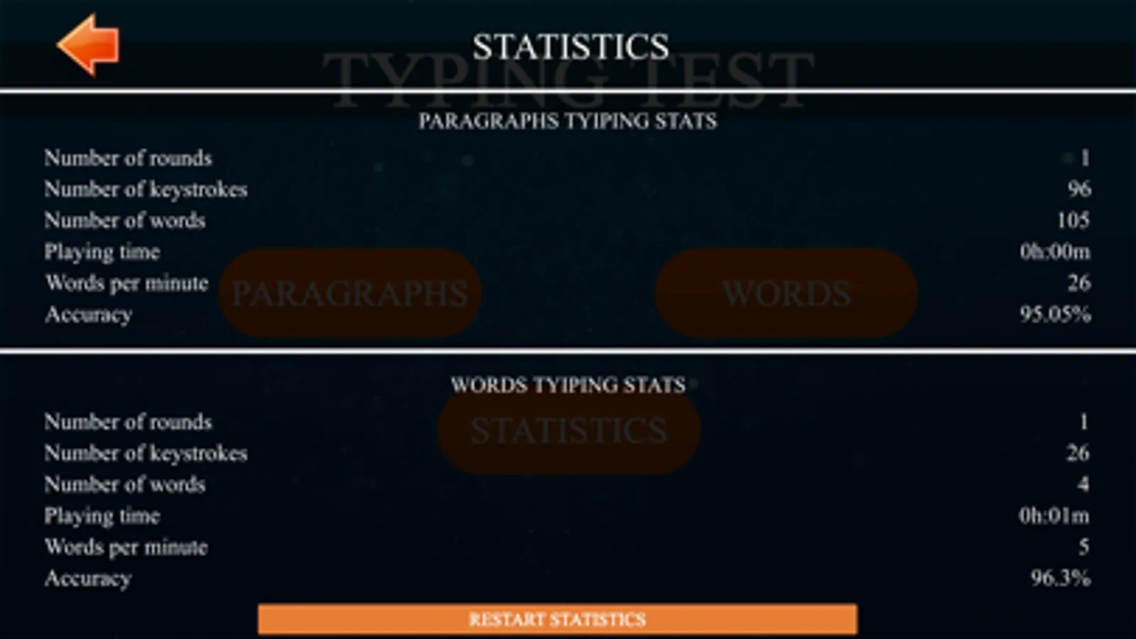 In the Statistics menu you can track your typing speed (wpm), accuracy, number of keystrokes and words typed, and time spent in-game.