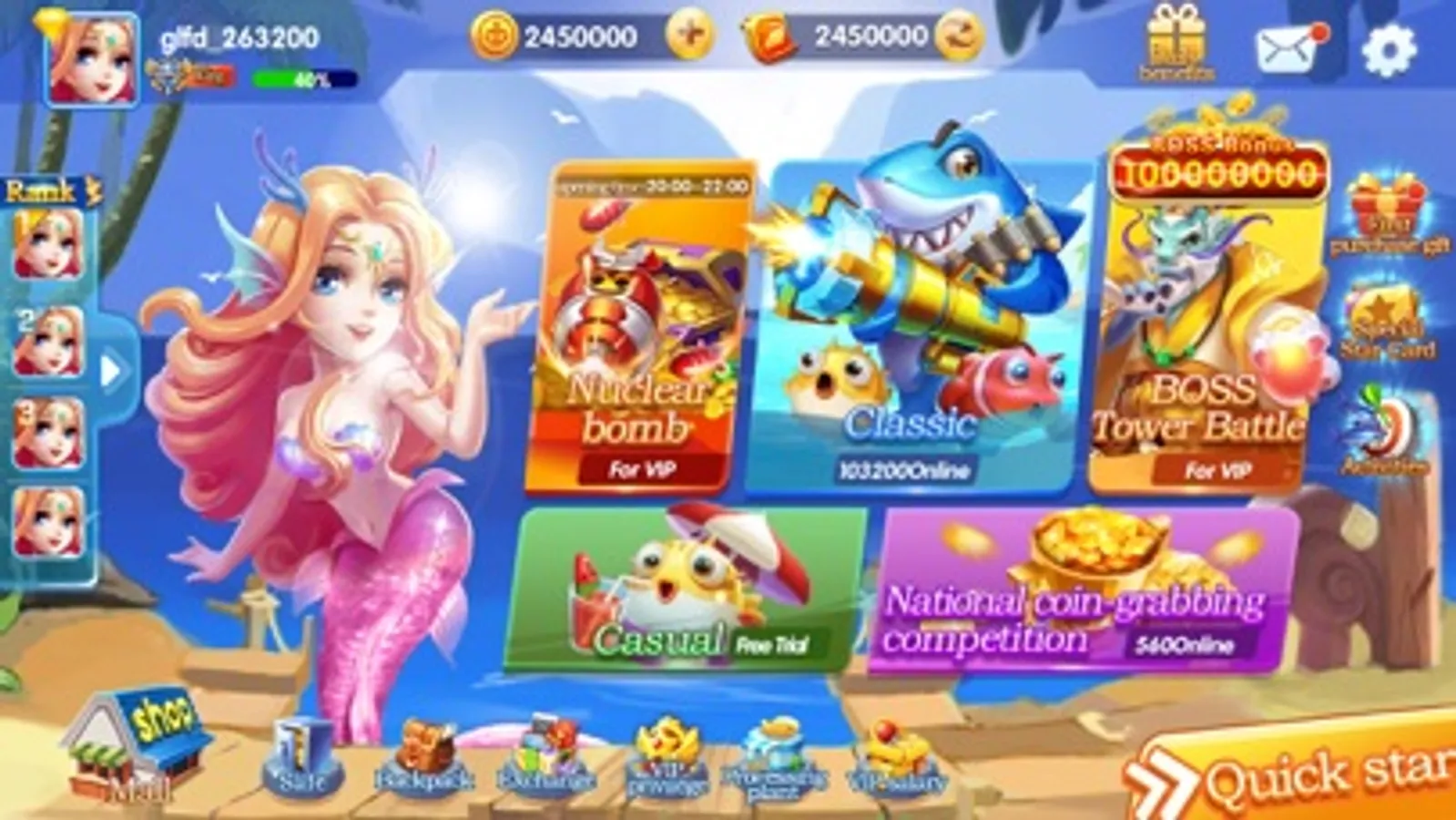 It allows multiple people to play together. Upgrade the cannon to get more rewards. You can also use a variety of props to help catch big fishes. Participate in the special activity Golden Dragon to win a surprise treasures!