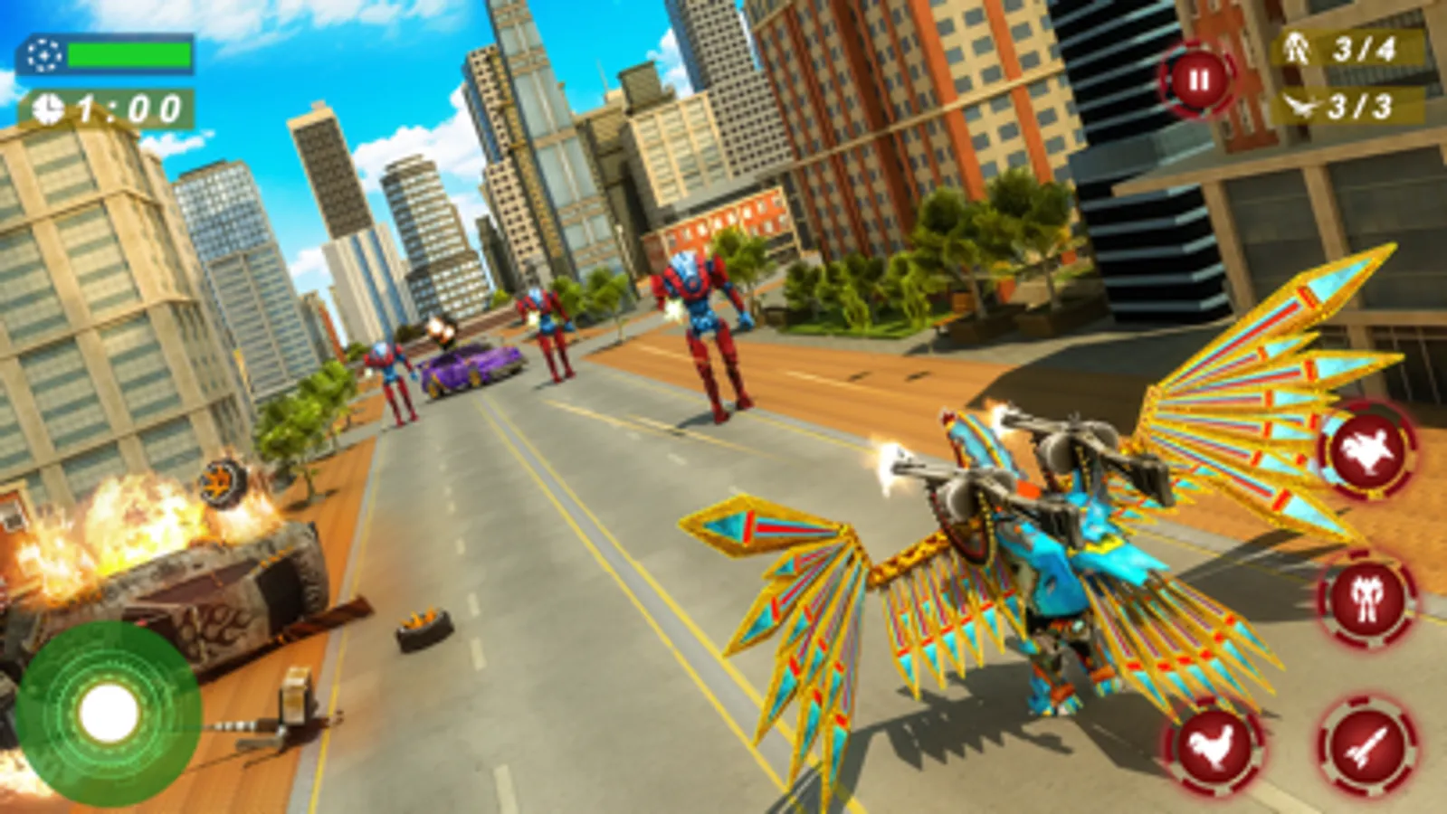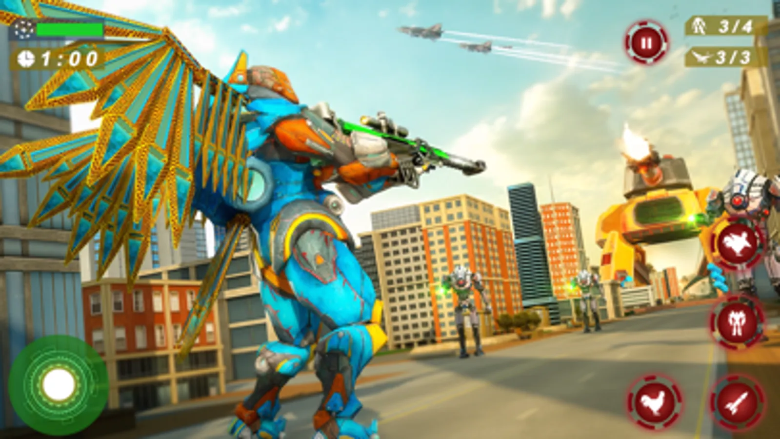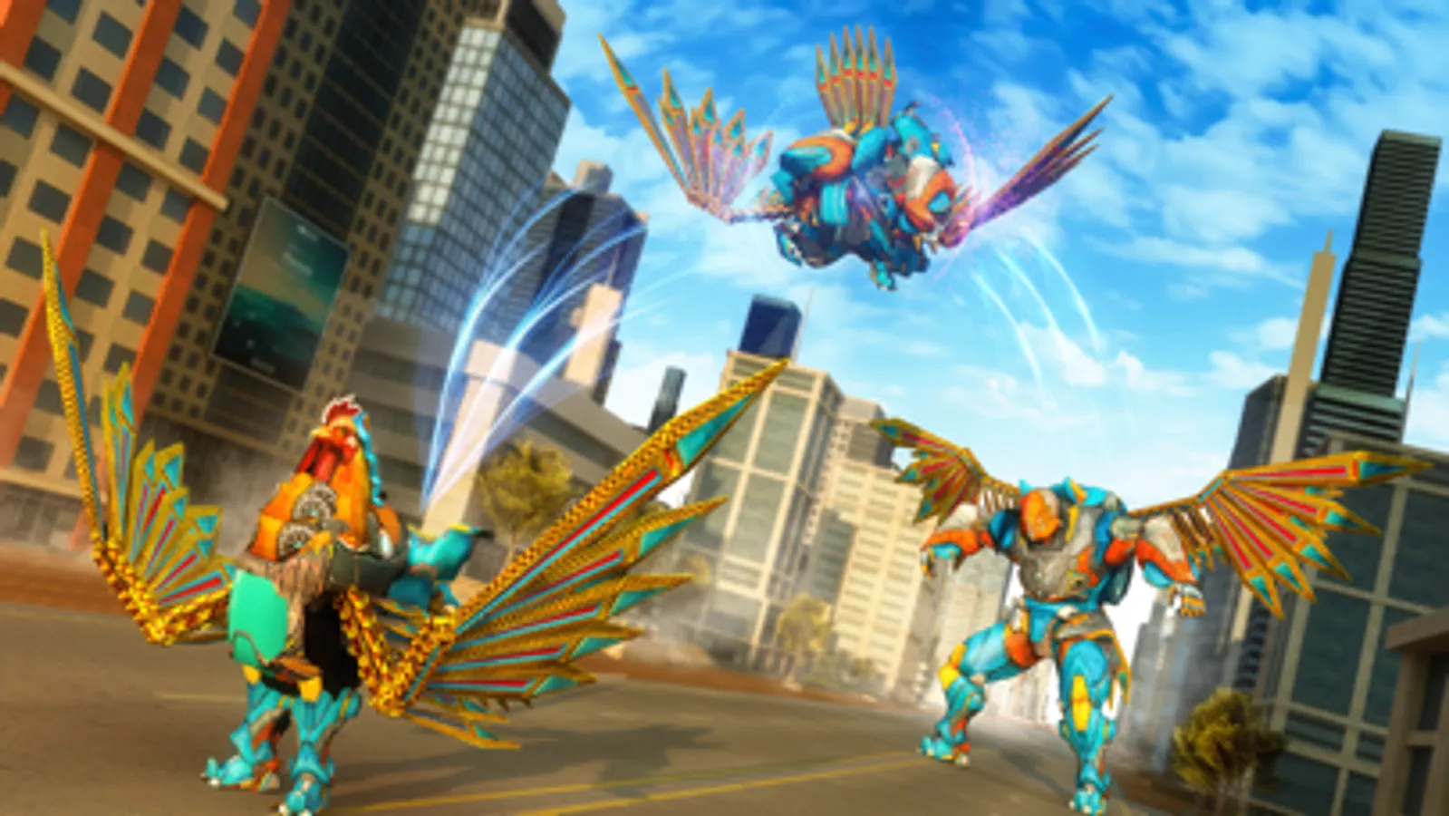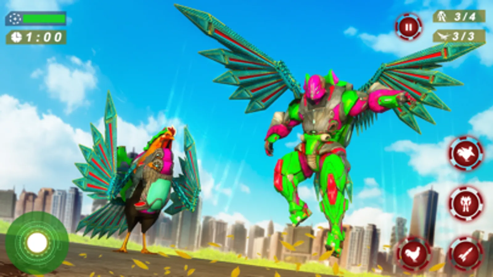 You have played many robot games and robot transforming games but never see the flying Hen robot battle where you will be a rooster in the city and when enemies attack you will convert into robot warrior.