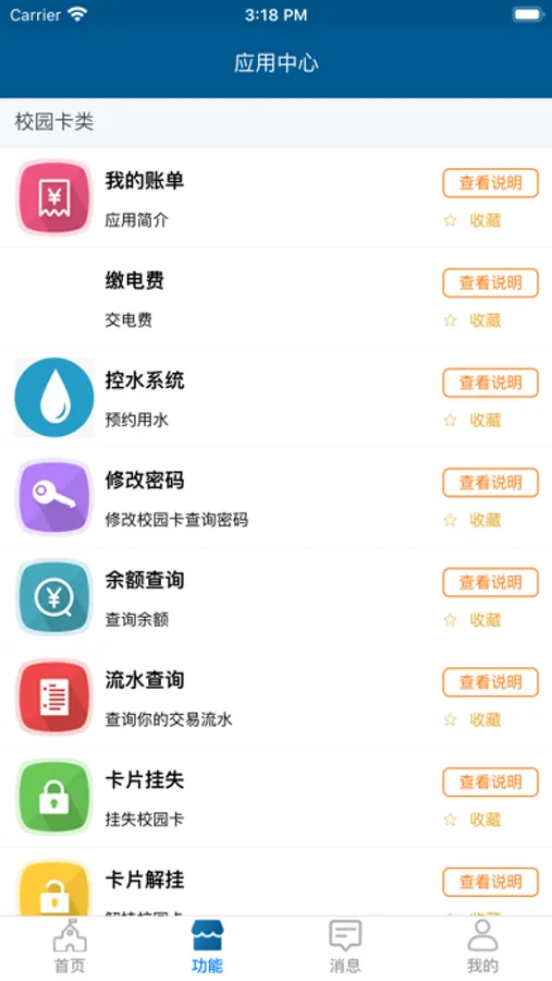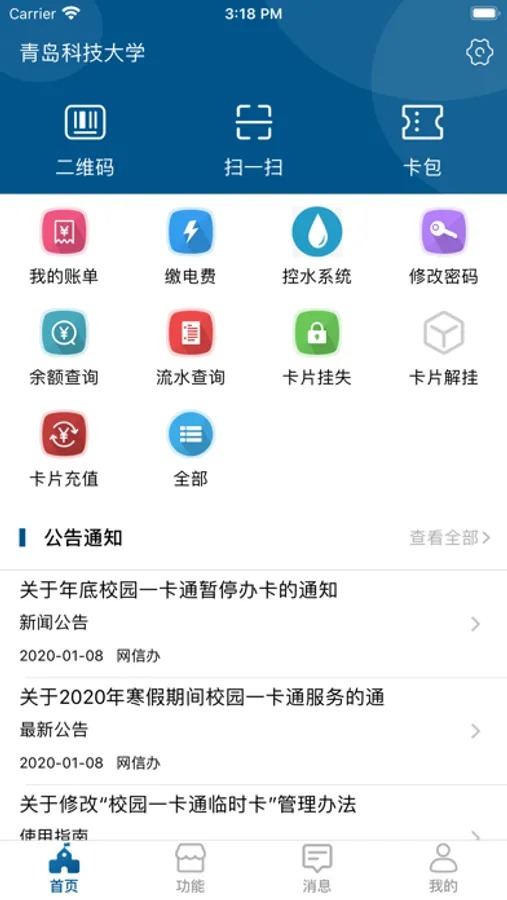 提供全面的校园卡服务,充值、信息查询、账单查询、流水查询、挂失/解挂、失卡招领、校园卡在线申请、校友注册等