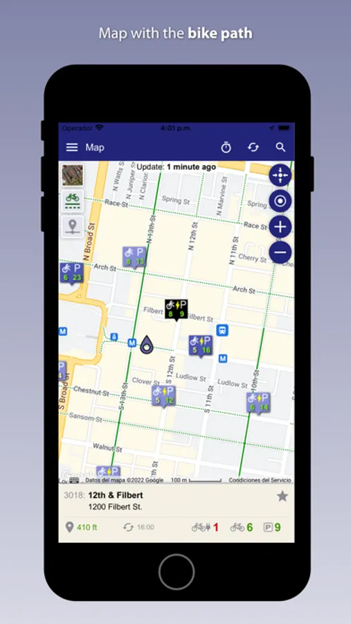 - Map of the city with the position of stations showing the number of bikes and the free stands for each station. It includes also the BIKE PATH.