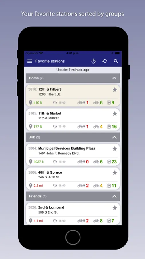 - List of favorite stations categorized by groups (home, work, friends or general).