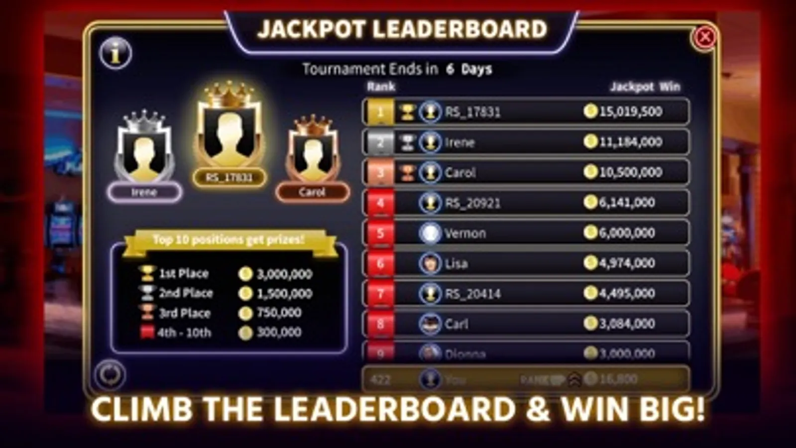 - Climb the leaderboard! Highest individual jackpots to get those top positions in the new and improved Fantasy Springs Slots!