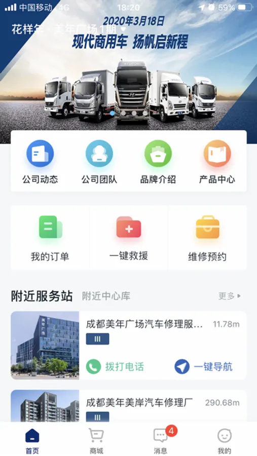 现代商用畅行服务,现代商用车家族服务,自己掌控的服务,一键救援,服务预约,配件选购,服务站点查询,积分乐享,做好你的贴心管家,让你乐享不停。