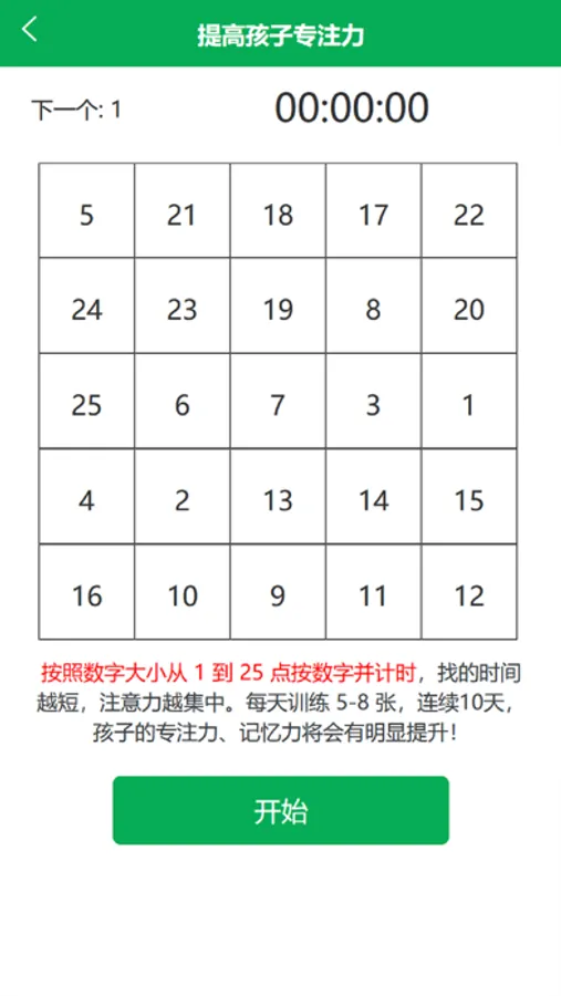 按照数字大小从 1 到 25 点按数字并计时,找的时间越短,注意力越集中。每天训练 5-8 张,连续10天,孩子的专注力、记忆力将会有明显提升!