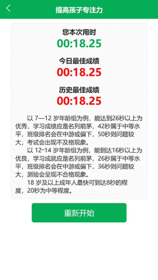 以 7—12 岁年龄组为例,能达到26"以上为优秀,学习成绩应是名列前茅, 42"属于中等水平,班级排名会在中游或偏下, 50"则问题较大,考试会出现不及格现象。