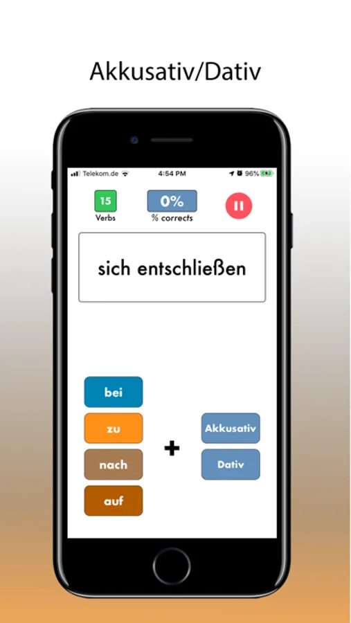 You must properly match the verb presented on the screen with its respective preposition and wisely select whether it is "Akkusativ or Dativ". You have 15 opportunities. When you have reached at least five times in a row 100%, you can reasonably consider you have reached an important level in the German language.