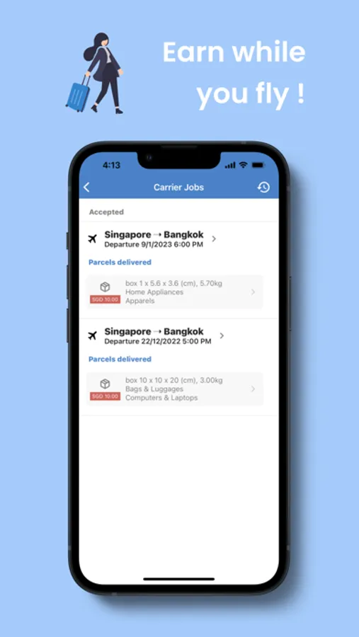 The mobile app creates earning opportunities for Air Travellers by allowing them to register as an on-board courier capitalising on their unused check-in and hand carry luggage allowances to air courier parcel(s) for the Customer for a given fee. As an assurance to the Air Travellers, all parcels will be securely screened, and security cleared to ensure that they are safe to be carried.