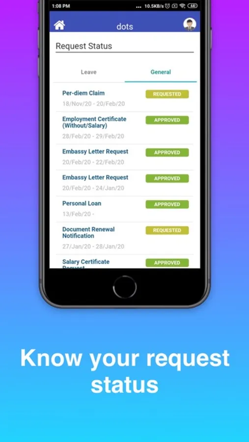 DOTS HR is an established HR software platform for managing employee records. This extended mobile application will be used by the employees within the organization, for mainly placing various requests and to view their personal information