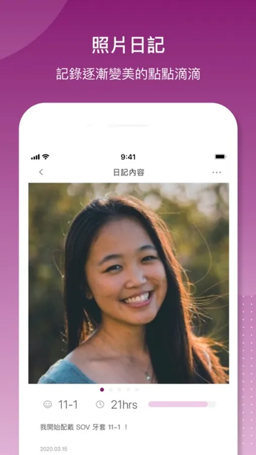 SOV Diary is an app designed specially for the needs for the users of SOV Brace. It helps you to record your brace usage detailedly, and accompany you to gradually get a beautiful smile.