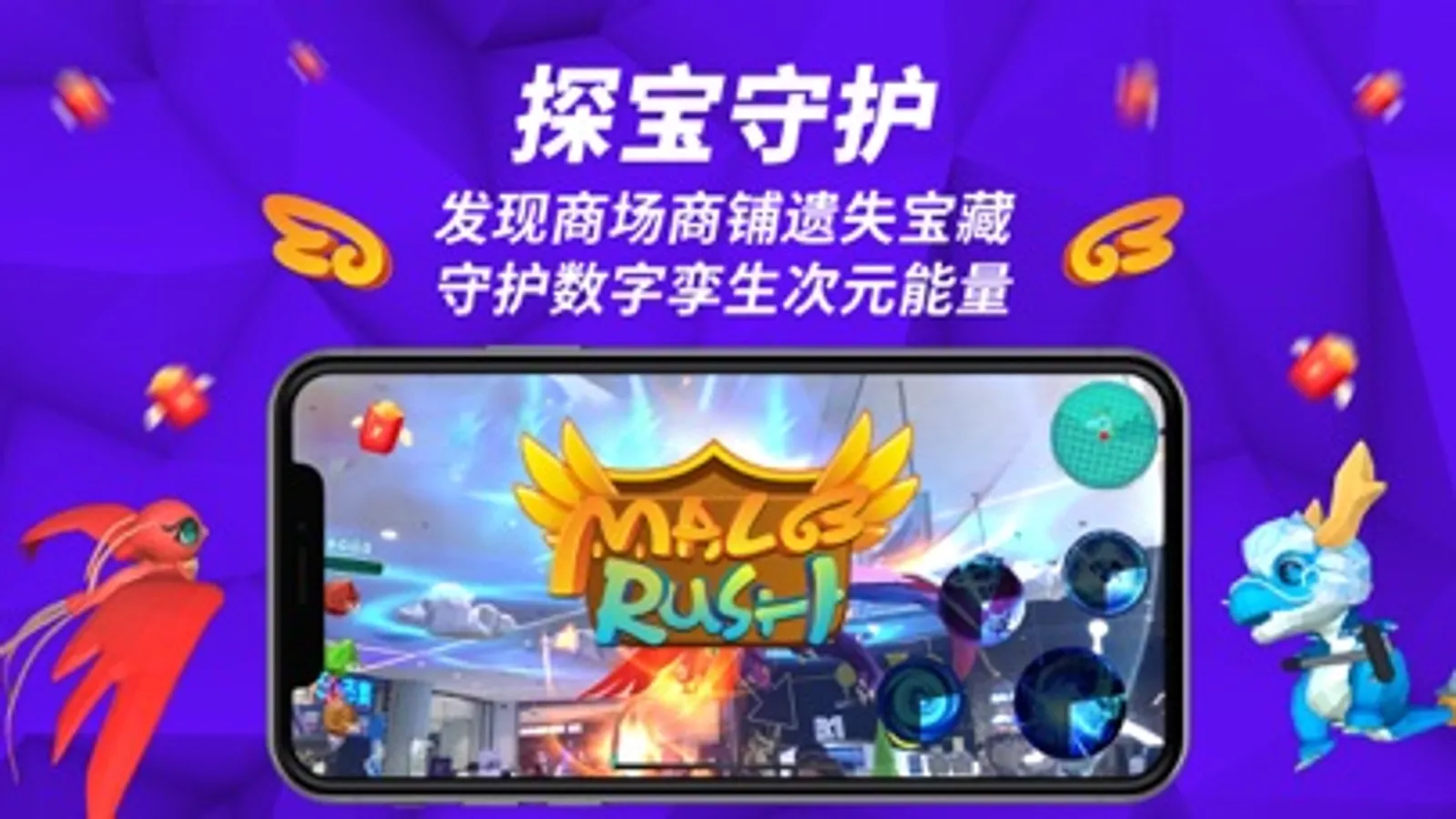 《Mall Rush 商场守护者》虚实融合的MR商业互娱体验APP。用户通过手机打开摄像头,可以看到真实环境和设计过的虚拟的平行世界一起的混合空间。用户可以通过使用空间中的角色打开虚拟空间中不同的混元星,混元星中有现实可以消费的优惠券,获得优惠券后用户可以使用优惠券去真实的店铺消费。