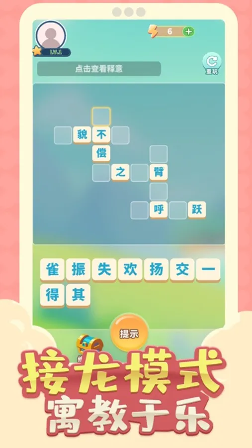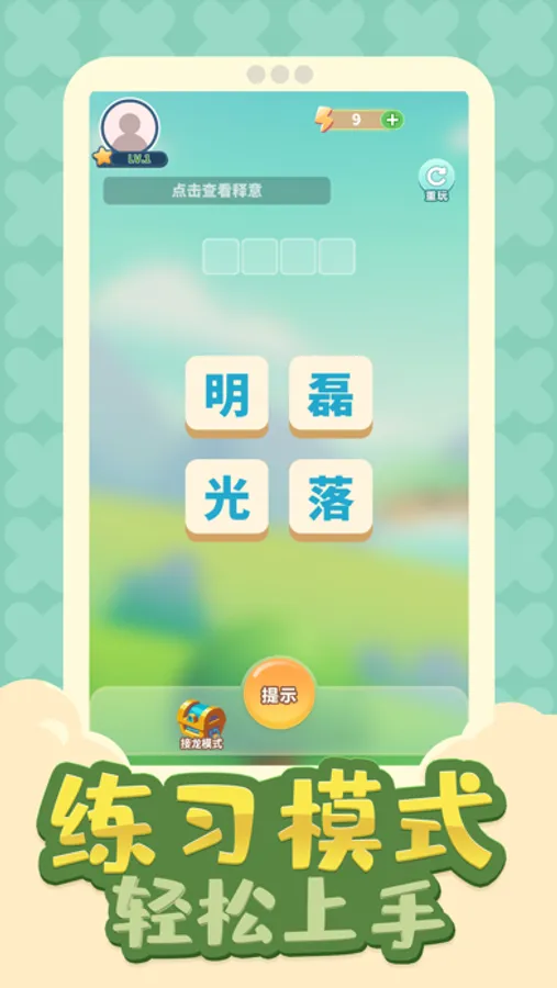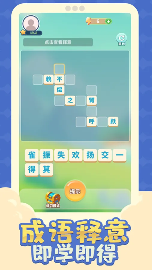 《我爱猜成语》是一款益智小游戏,巧妙地用一幅画或几个字的组合来猜一个成语,让你苦思冥想后恍然大悟,开怀一笑!既可以愉悦心情,又可以训练思维,巩固加深对成语的理解和认识。