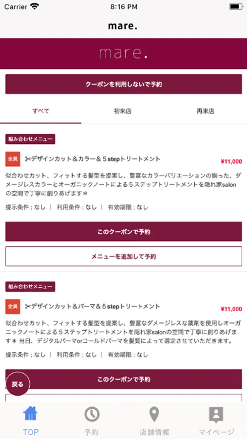 お得なクーポンが配信されます。ネット予約時にクーポン利用での予約も可能なので来店時もスムーズに施術頂けます。