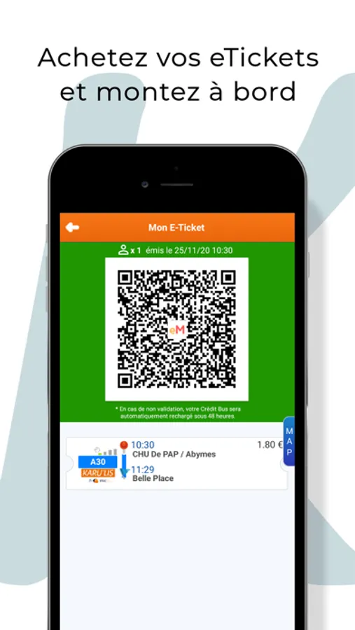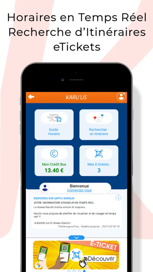 Découvrez dès maintenant le e-ticket ! Sélectionnez votre itinéraire, achetez votre eTicket depuis l’application KARULIS et montez à bord en validant avec votre Smartphone !
